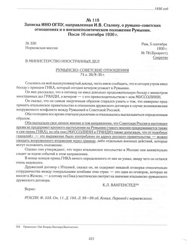Записка ИНО ОГПУ, направленная И. В. Сталину, о румыно-советских отношениях и о внешнеполитическом положении Румынии. После 10 сентября 1930 г. // РГАСПИ. Ф. 558. Оп. 11. Д. 184. Л. 98-98 об. Копия. Перевод с норвежского.