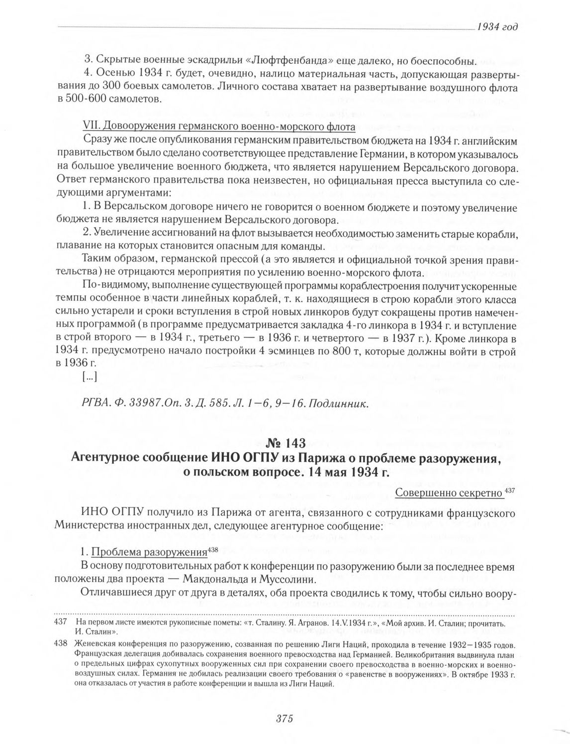 Агентурное сообщение ИНО ОГПУ из Парижа о проблеме разоружения, о польском вопросе. 14 мая 1934 г. // РГАСПИ. Ф. 558. Оп. 11. Д. 187. Л. 9-23. Подлинник.
