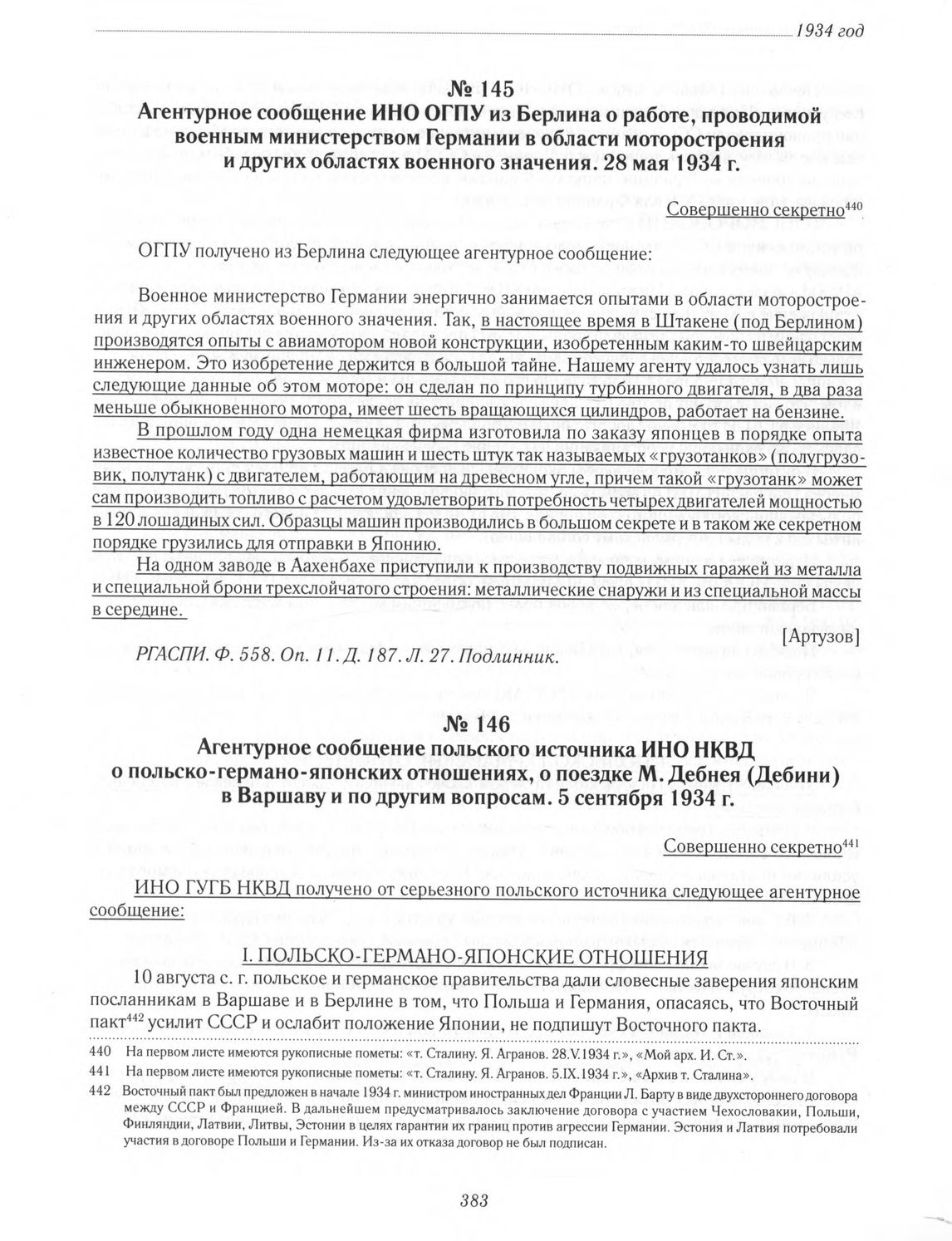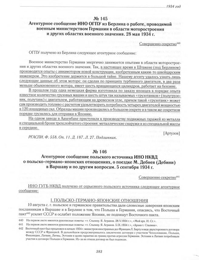 Агентурное сообщение ИНО ОГПУ из Берлина о работе, проводимой военным министерством Германии в области моторостроения и других областях военного значения. 28 мая 1934 г. // РГАСПИ. Ф. 558. Оп. 11. Д. 187. Л. 27. Подлинник.