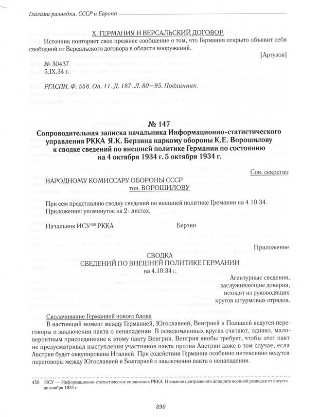 Сопроводительная записка начальника Информационно-статистического управления РККА Я. К. Берзина наркому обороны К. Е. Ворошилову к сводке сведений по внешней политике Германии по состоянию на 4 октября 1934 г. 5 октября 1934 г. // РГВА. Ф. 33987. Оп. З. Д. 585. Л. 115-117. Подлинник.