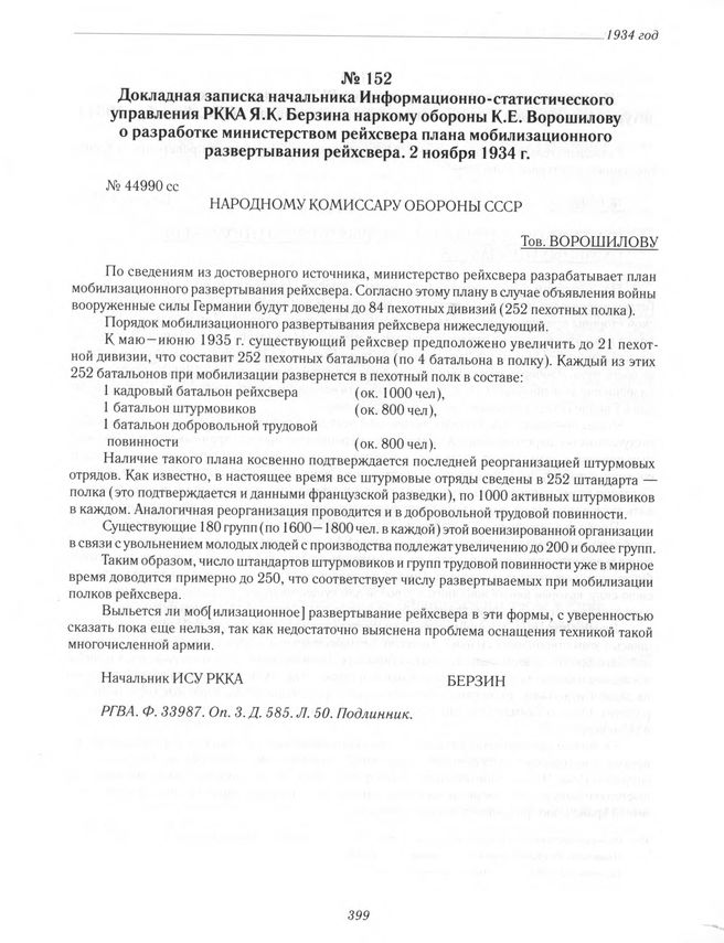 Докладная записка начальника Информационно-статистического управления РККА Я. К. Берзина наркому обороны К. Е. Ворошилову о разработке министерством рейхсвера плана мобилизационного развертывания рейхсвера. 2 ноября 1934 г. // РГВА. Ф. 33987. Оп. З. Д. 585. Л. 50. Подлинник.