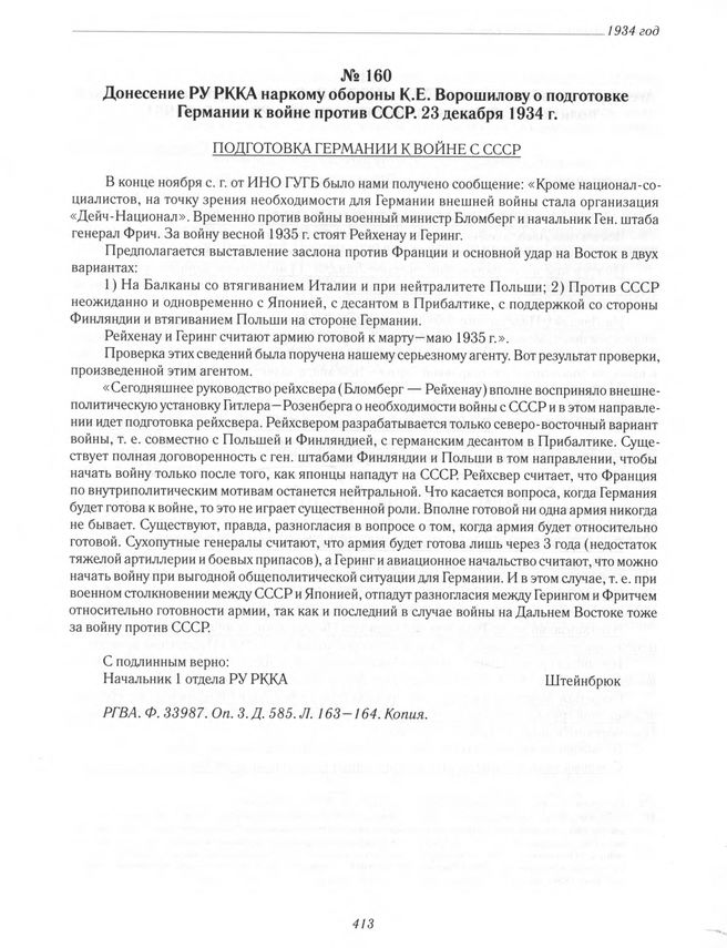 Донесение РУ РККА наркому обороны К. Е. Ворошилову о подготовке Германии к войне против СССР. 23 декабря 1934 г. // РГВА. Ф. 33987. Оп. З. Д. 585. Л. 163-164. Копия.