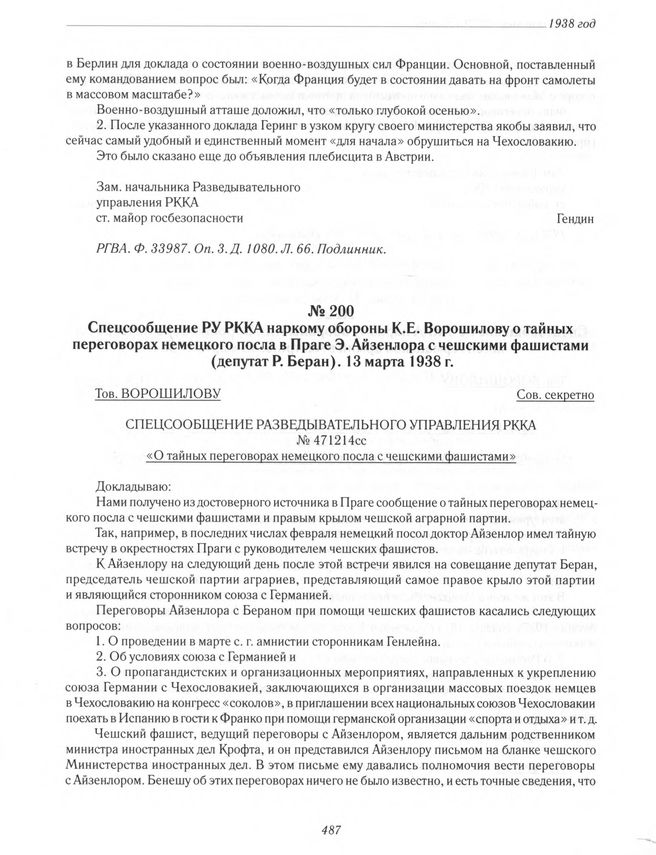 Спецсообщение РУ РККА наркому обороны К. Е. Ворошилову о тайных переговорах немецкого посла в Праге Э. Айзенлора с чешскими фашистами (депутат Р. Беран). 13 марта 1938 г.