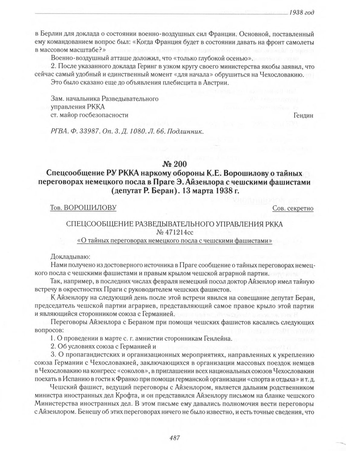 Спецсообщение РУ РККА наркому обороны К. Е. Ворошилову о тайных переговорах немецкого посла в Праге Э. Айзенлора с чешскими фашистами (депутат Р. Беран). 13 марта 1938 г. // РГВА. Ф. 33987. Оп. З. Д. 1080. Л. 67-68. Подлинник.
