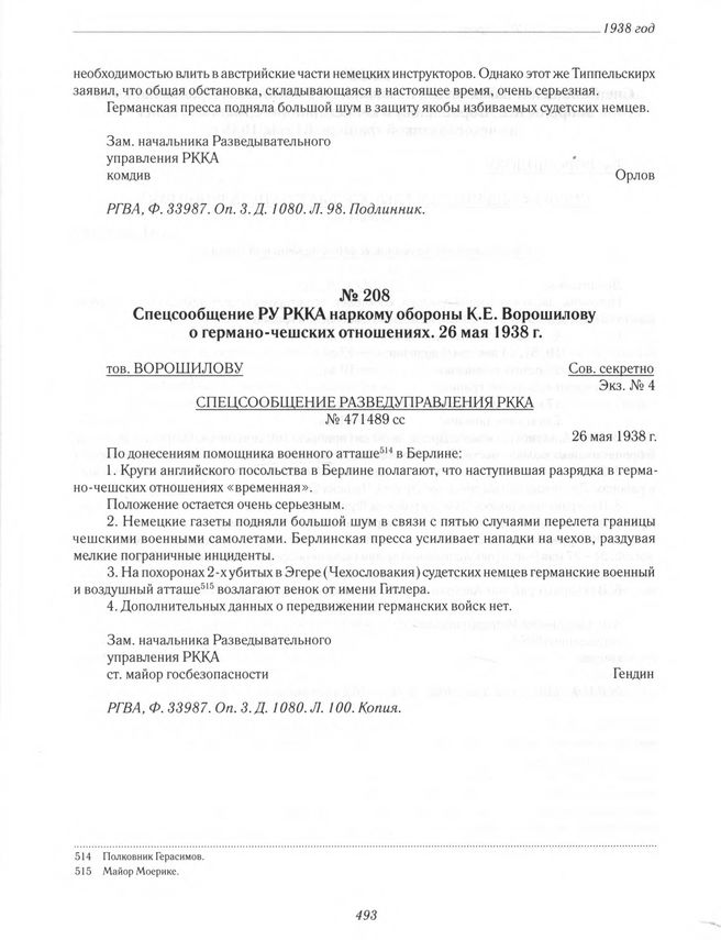 Спецсообщение РУ РККА наркому обороны К. Е. Ворошилову о германо-чешских отношениях. 26 мая 1938 г. // РГВА, Ф. 33987. Оп. З. Д. 1080. Л. 100. Копия.
