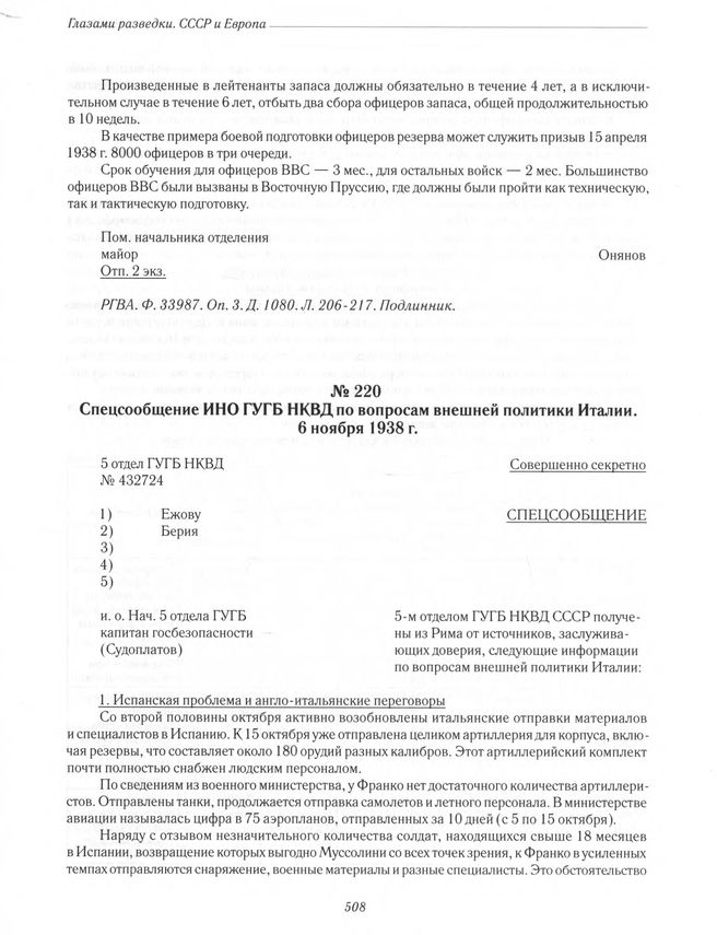 Спецсообщение ИНО ГУГБ НКВД по вопросам внешней политики Италии. 6 ноября 1938 г. // Архив СВР. Подлинник.