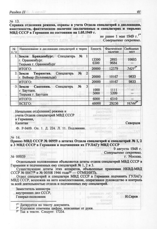 Приказ МВД СССР № 00959 о штатах Отдела спецлагерей и спецлагерей №1, 2 и 3 МВД СССР в Германии и подчинении их ГУЛАГу МВД СССР. 9 августа 1948 г.