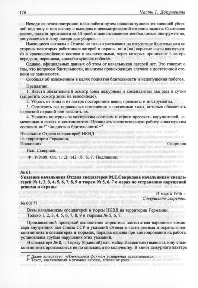 Указание начальника Отдела спецлагерей М.Е.Свиридова начальникам спецлагерей № 1, 2,3, 4, 5, 6, 7, 8, 9 и тюрем № 5,6, 7 о мерах по устранению нарушений режима и охраны. 14 марта 1946 г. // Ф. P-9409. Oп. 1. Д. 144. Л. 14. Заверенная копия.