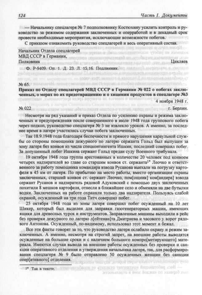 Приказ по Отделу спецлагерей МВД СССР в Германии № 022 о побегах заключенных, о мерах по их предотвращению и о хищении продуктов в спецлагере №3. 4 ноября 1948 г.