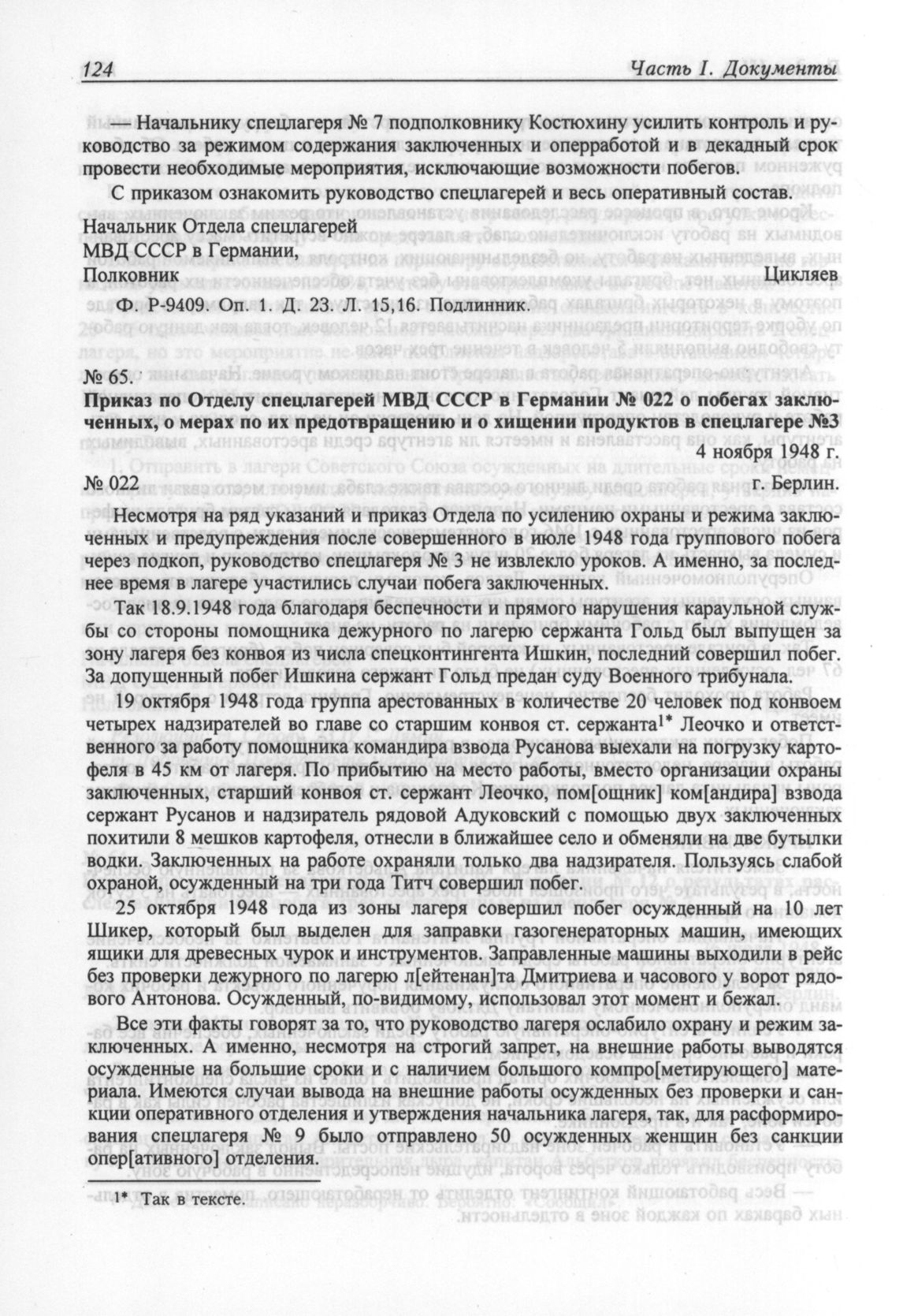 Приказ по Отделу спецлагерей МВД СССР в Германии № 022 о побегах заключенных, о мерах по их предотвращению и о хищении продуктов в спецлагере №3. 4 ноября 1948 г. // Ф. P-9409. Oп. 1. Д. 23. Л. 30-33. Подлинник.