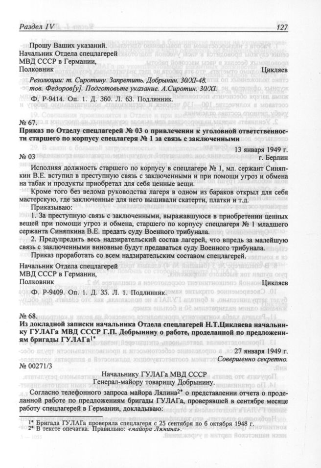 Из докладной записки начальника Отдела спецлагерей Н.Т.Цикляева начальнику ГУЛАГа МВД СССР Г.П. Добрынину о работе, проделанной по предложениям бригады ГУЛАГа. 27 января 1949 г.