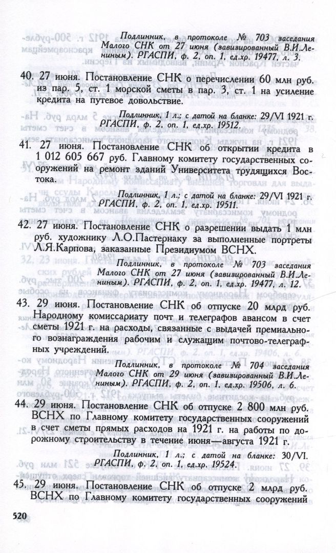 29 июня. Постановление СНК об отпуске 2 млрд руб. ВСНХ по Главному комитету государственных сооружений в счет сметы на 1921 г. на расходы по водному строительству в течение июня—августа 1921 г. // Подлинник, в протоколе № 704 заседания Малого СНК от 29 июня (завизированный В.И.Лениным). РГАСПИ, ф. 2, oп. 1, ед.хр. 19506, л. 2.