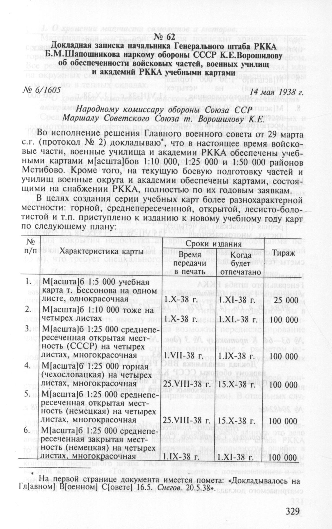 Докладная записка начальника Генерального штаба РККА Б.М.Шапошникова наркому обороны СССР К.Е.Ворошилову об обеспеченности войсковых частей, военных училищ и академий РККА учебными картами. 14 мая 1938 г.