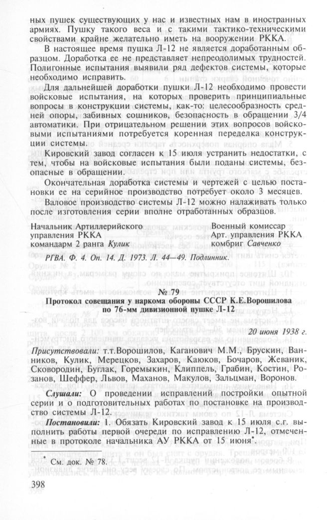 Протокол совещания у наркома обороны СССР К.Е.Ворошилова по 76-мм дивизионной пушке Л-12. 20 июня 1938 г. // РГВА. Ф. 4. Оп. 18. Д. 46. Л. 119-120. Заверенная копия.