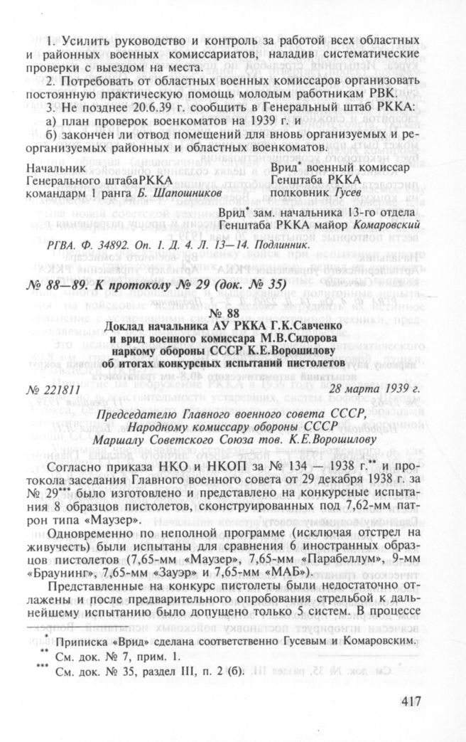 Доклад начальника АУ РККА Г.К.Савченко и врио военного комиссара М.В.Сидорова наркому обороны СССР К.Е.Ворошилову об итогах конкурсных испытаний пистолетов. 28 марта 1939 г.