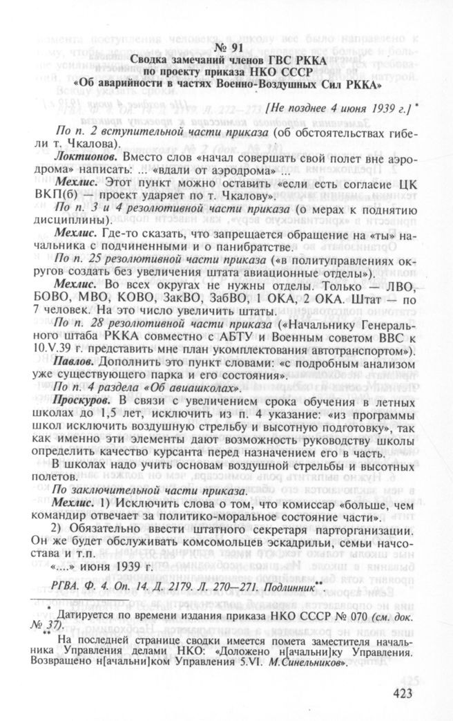 Сводка замечаний членов ГВС РККА по проекту приказа НКО СССР «Об аварийности в частях Военно-Воздушных Сил РККА. [Не позднее 4 июня 1939 г.] // РГВА. Ф. 4. Оп. 14. Д. 2179. Л. 270-271. Подлинник.