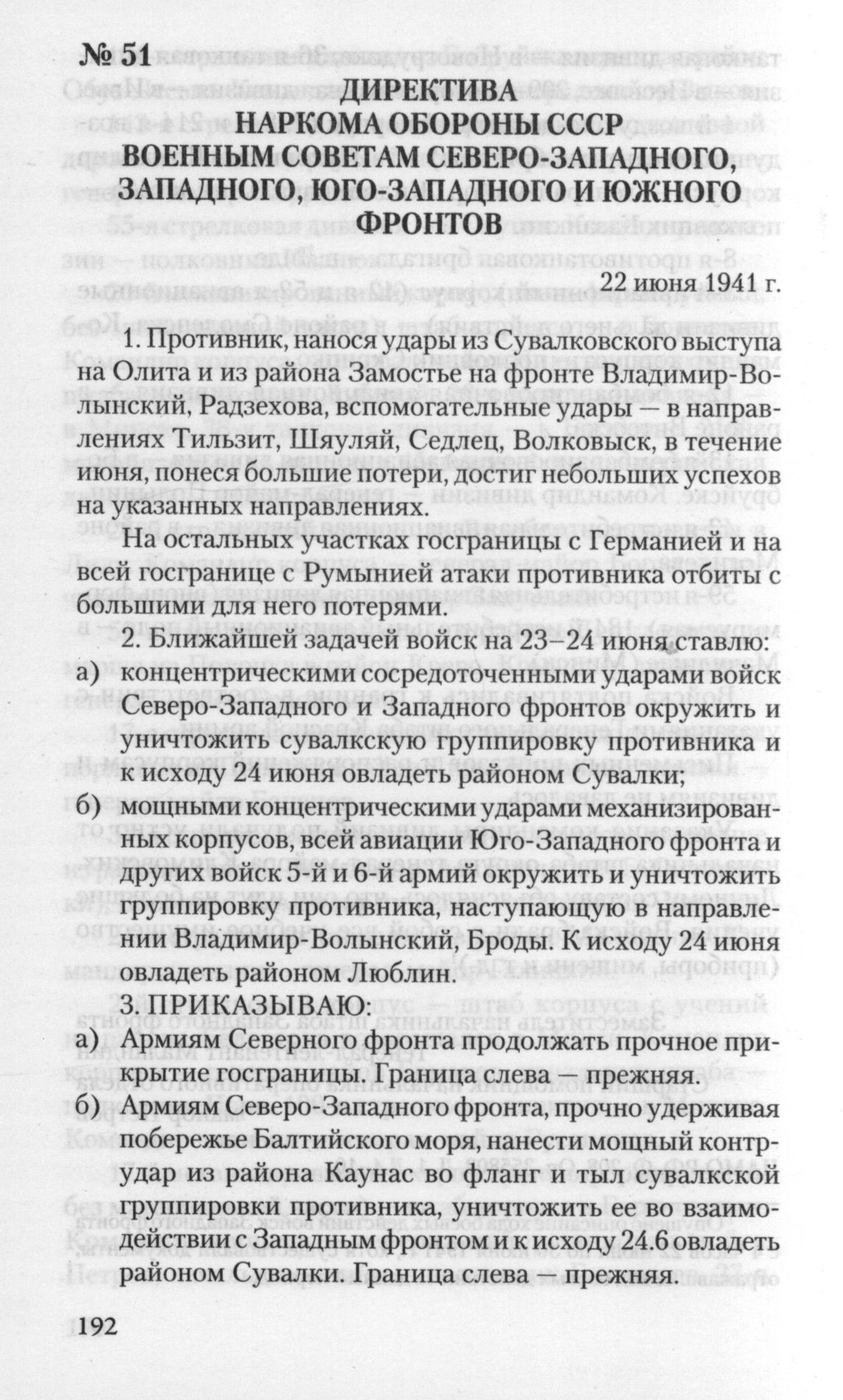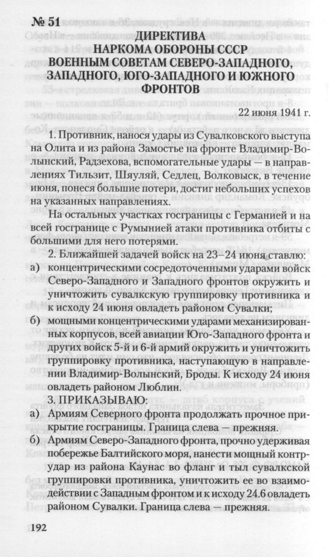 Директива наркома обороны СССР военным советам Северо-Западного, Западного, Юго-Западного и Южного фронтов. 22 июня 1941 г. // ЦАМО РФ. Ф. 48а. Оп. 1554. Д. 90. Л. 260-262.