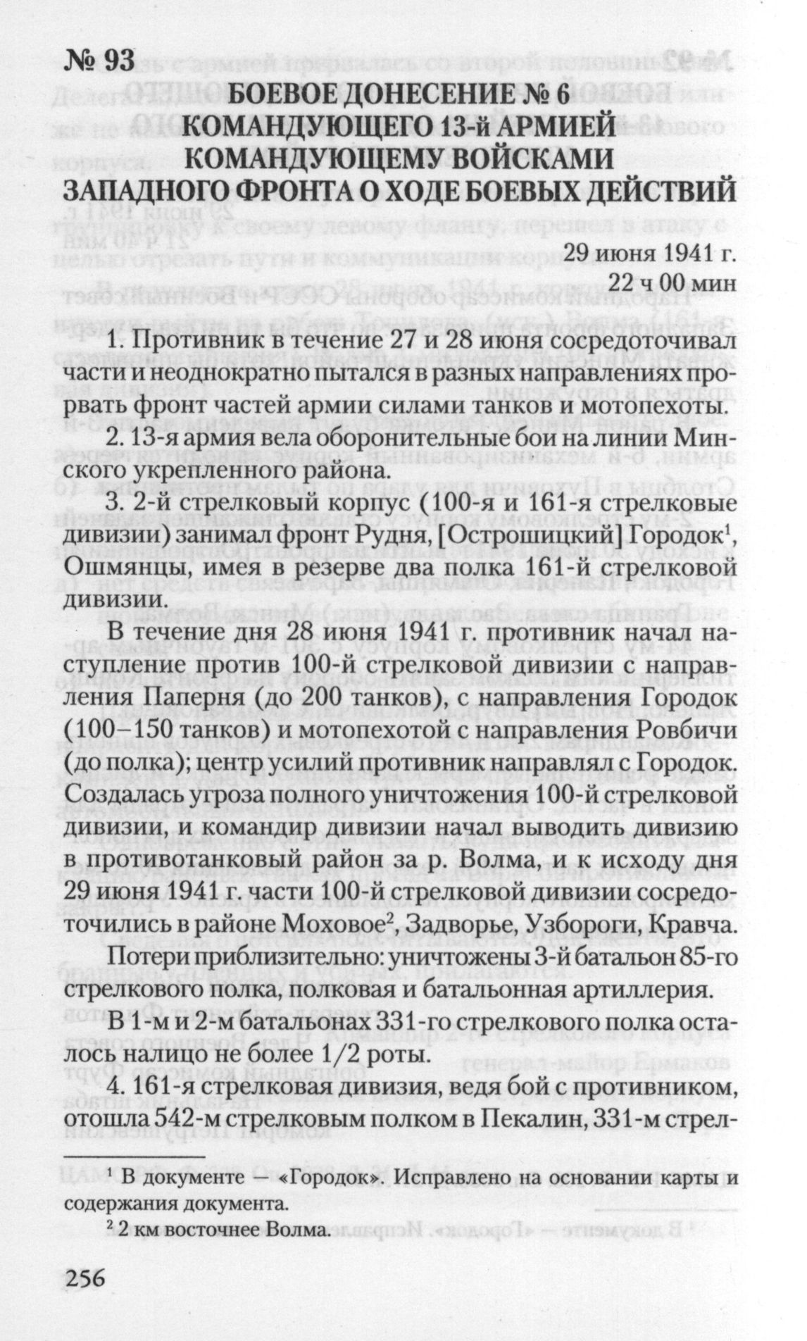 Боевое донесение № 6 командующего 13-й армией командующему войсками Западного фронта о ходе боевых действий. 29 июня 1941 г. // ЦАМО РФ. Ф. 208. Оп. 3038. Д. 21. Л. 20-22.