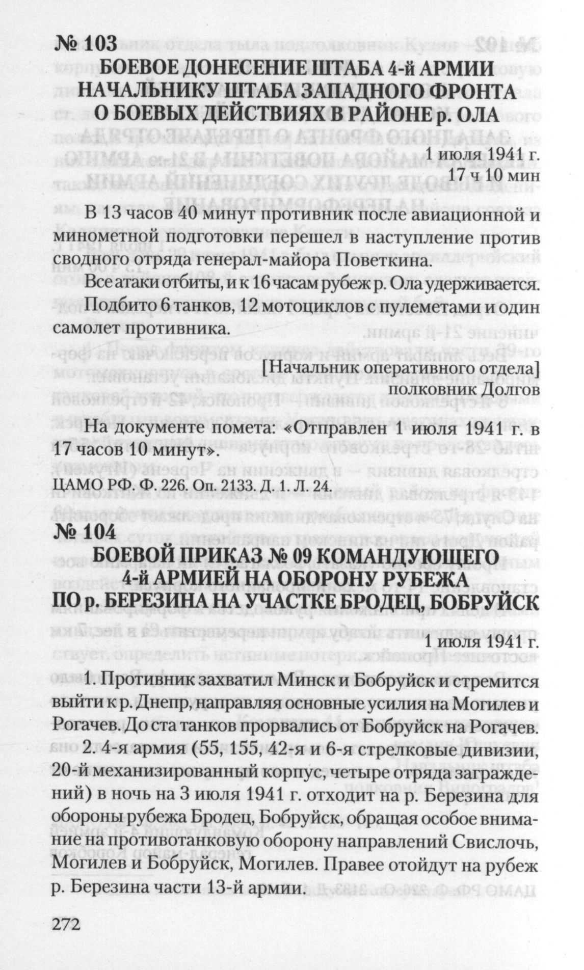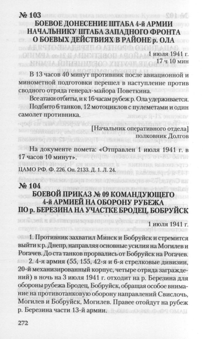 Боевой приказ № 09 командующего 4-й армией на оборону рубежа по р. Березина на участке Бродец, Бобруйск. 1 июля 1941 г. // ЦАМО РФ. Ф. 226. Оп. 2156. Д. 70. Л. 14-15.