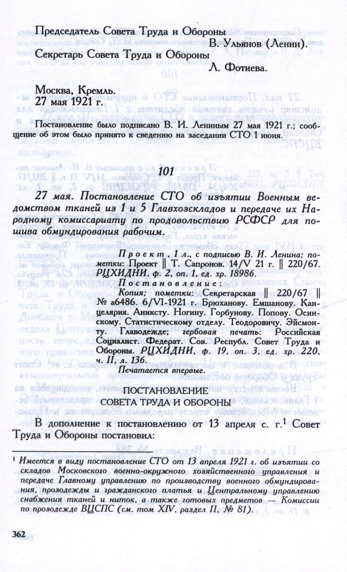27 мая. Постановление СТО об изъятии Военным ведомством тканей из 1 и 5 Главхозскладов и передаче их Народному комиссариату по продовольствию РСФСР для пошива обмундирования рабочим // Проект, 1 л., с подписью В. И. Ленина; пометки: Проект || Т. Сапронов. 14/V 21 г. || 220/67. РЦХИДНИ, ф. 2, oп. 1, ед. хр. 18986. Постановление: Копия; пометки: Секретарская || 220/67 № а6486. 6/V1-1921 г. Брюханову. Емшанову. Канцелярия. Аниксту. Ногину. Горбунову. Попову. Осинскому. Статистическому отделу. Теодоровичу. Эйсмонту. Главодежде; гербовая печать: Российская Социалист. Федерат. Сов. Республ. Совет Труда и Обороны. РЦХИДНИ, ф. 19, oп. 3, ед. хр. 220, ч. II. л. 136. Печатается впервые.