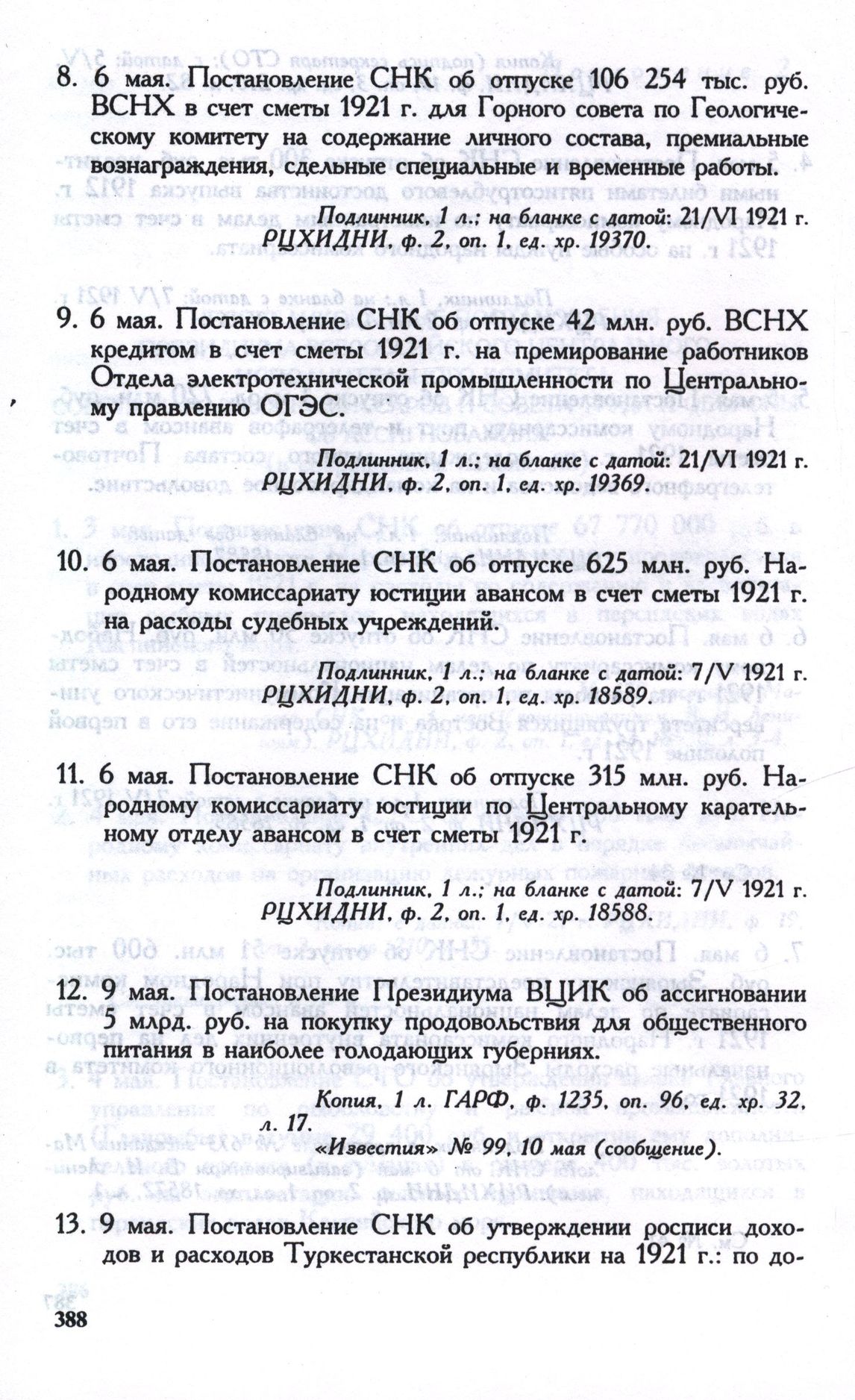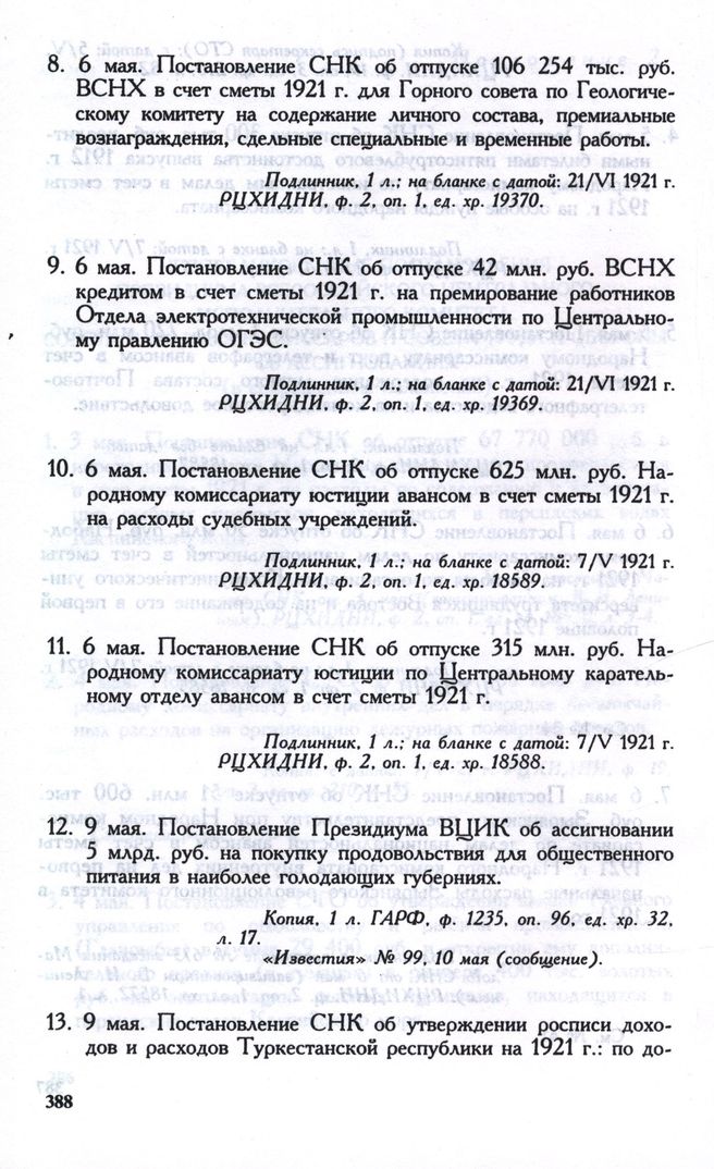 6 мая. Постановление СНК об отпуске 42 млн. руб. ВСНХ кредитом в счет сметы 1921 г. на премирование работников Отдела электротехнической промышленности по Центральному правлению ОГЭС // Подлинник, 1 л.; на бланке с датой: 21/VI 1921 г. РЦХИДНИ, ф. 2, oп. 1, ед. хр. 19369.