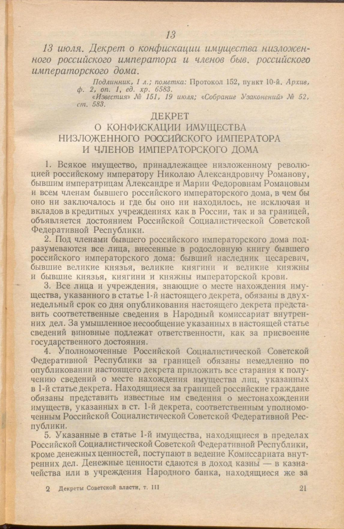 Главная Серия «Экономическая история. Документы, исследования, переводы» Декреты советской власти в 18 т. Декреты Советской власти. Т. III. 11 июля – 9 ноября 1918 г. Документы 13 июля. Декрет о конфискации имущества низложенного российского им...