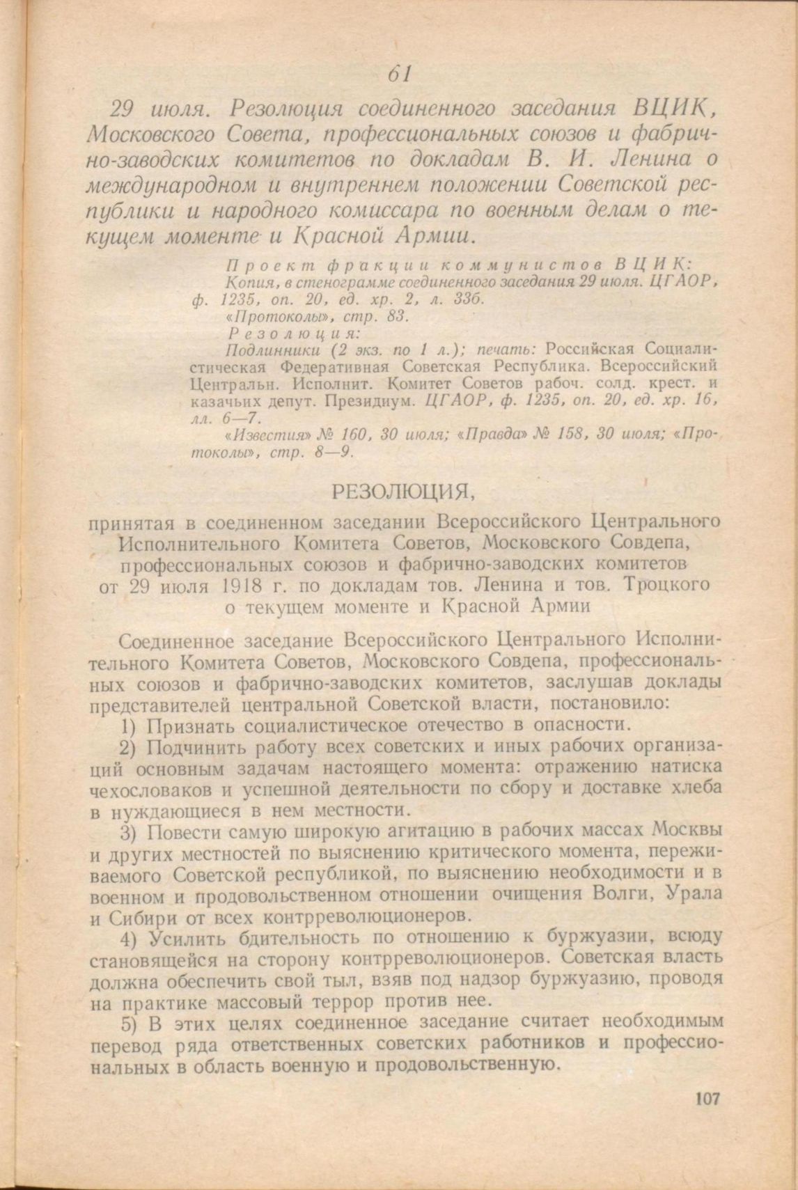 29 июля. Резолюция соединенного заседания ВЦИК, Московского Совета, профессиональных союзов и фабрично-заводских комитетов по докладам В. И. Ленина о международном и внутреннем положении Советской республики и народного комиссара по военным делам о текущем моменте и Красной Армии // П р о е к т ф р а к ц и и к о м м у н и с т о в В Ц И К: Копия, в стенограмме соединенного заседания 29 июля. ЦГАОР, ф. 1235, oп. 20, ед. хр. 2, л. 336. «Протоколы», стр. 83. Р е з о л ю ц и я: Подлинники (2 экз. по 1 л.); печать: Российская Социалистическая Федеративная Советская Республика. Всероссийский Центральн. Исполнит. Комитет Советов рабоч. солд. крест, и казачьих депут. Президиум. ЦГАОР, ф. 1235, oп. 20, ед. хр. 16, лл. 6—7. «Известия» № 160, 30 июля; «Правда» № 158. 30 июля; «Протоколы», стр. 8 — 9.