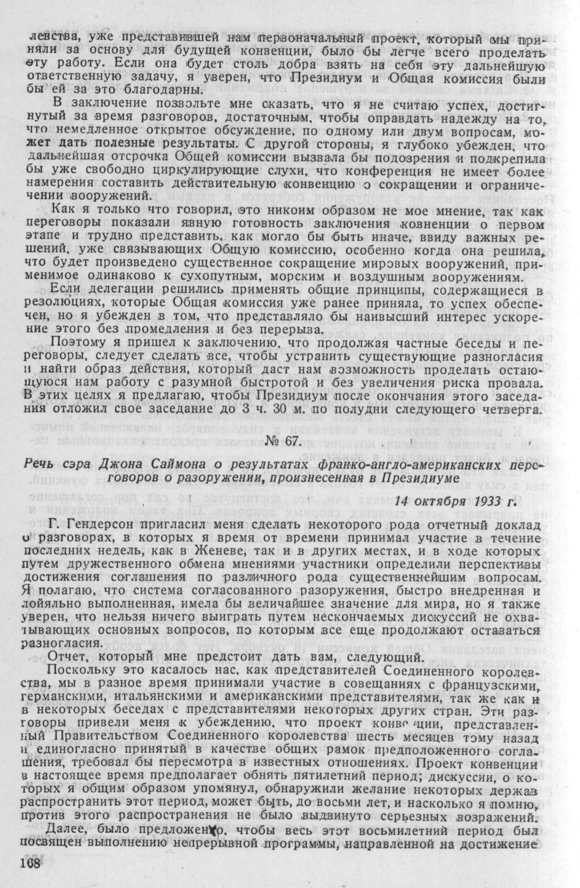 Речь сэра Джона Саймона о результатах франко-англо-американских переговоров о разоружении, произнесенная в Президиуме 14 октября 1933 г.