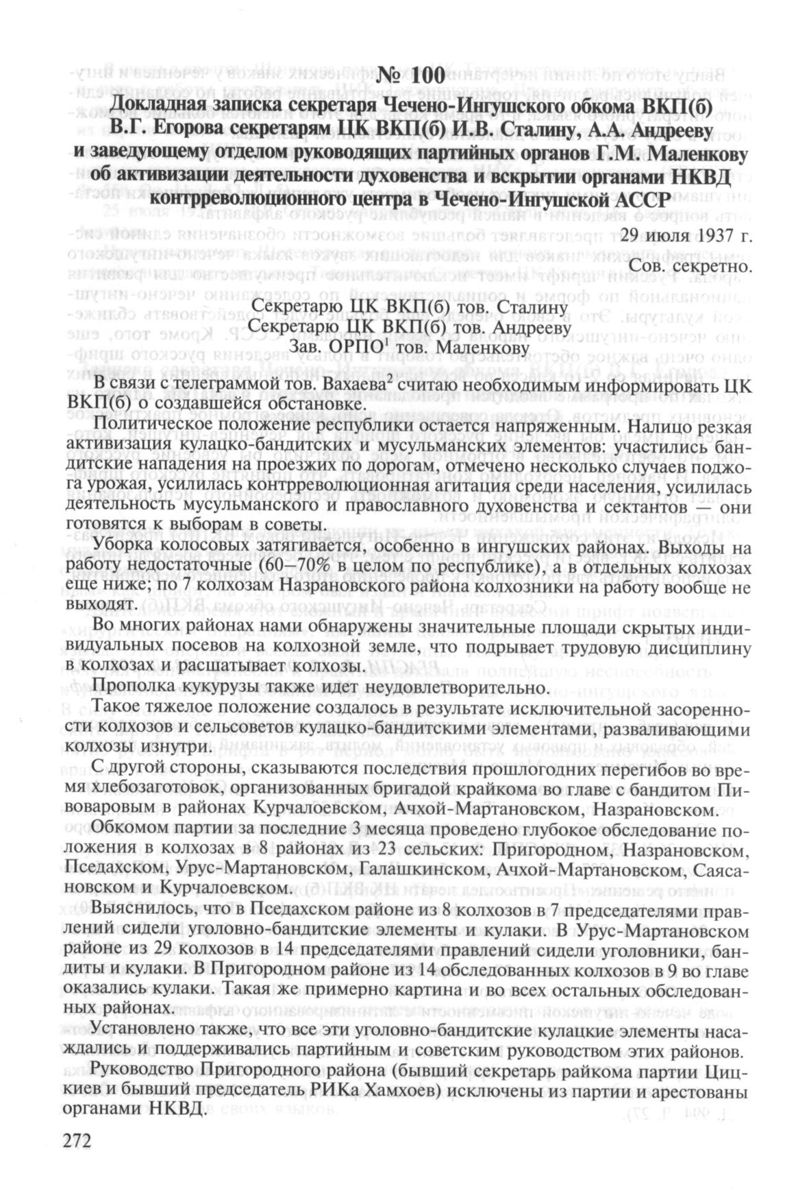 Докладная записка секретаря Чечено-Ингушского обкома ВКП(б) В.Г. Егорова секретарям ЦК ВКП(б) И.В. Сталину, А.А. Андрееву и заведующему отделом руководящих партийных органов Г.М. Маленкову об активизации деятельности духовенства и вскрытии органами НКВД контрреволюционного центра в Чечено-Ингушской АССР. 29 июля 1937 г.