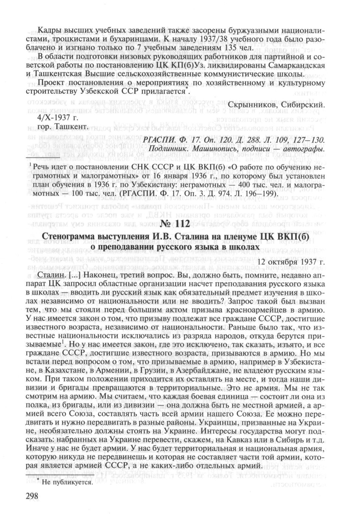 Стенограмма выступления И.В. Сталина на пленуме ЦК ВКП(б) о преподавании русского языка в школах. 12 октября 1937 г. // РГАСПИ. Ф. 558. Oп. 11. Д. 1120. Л. 99-102. Копия. Машинопись.