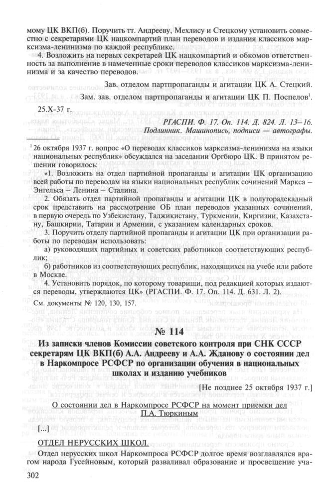 Из записки членов Комиссии советского контроля при СНК СССР секретарям ЦК ВКП(б) А.А. Андрееву и А.А. Жданову о состоянии дел в Наркомпросе РСФСР по организации обучения в национальных школах и изданию учебников. [Не позднее 25 октября 1937 г.] // РГАСПИ. Ф. 17. Oп. 114. Д. 824. Л. 257-259, 271-274, 293. Копия. Машинопись.