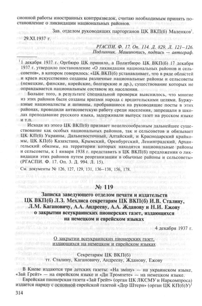 Записка заведующего отделом печати и издательств ЦК ВКП(б) Л.З. Мехлиса секретарям ЦК ВКП(б) И.В. Сталину, Л.М. Кагановичу, АЛ. Андрееву, А.А. Жданову и Н.И. Ежову о закрытии всеукраинских пионерских газет, издающихся на немецком и еврейском языках. 4 декабря 1937 г.