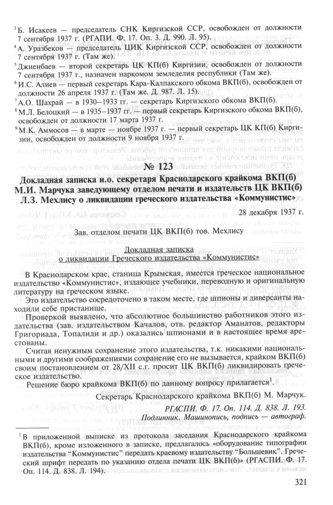 Докладная записка и.о. секретаря Краснодарского крайкома ВКП(б) М.И. Марчука заведующему отделом печати и издательств ЦК ВКП(б) Л.З. Мехлису о ликвидации греческого издательства «Коммунистис». 28 декабря 1937 г. // РГАСПИ. Ф. 17. Oп. 114. Д. 838. Л. 193. Подлинник. Машинопись, подпись — автограф.