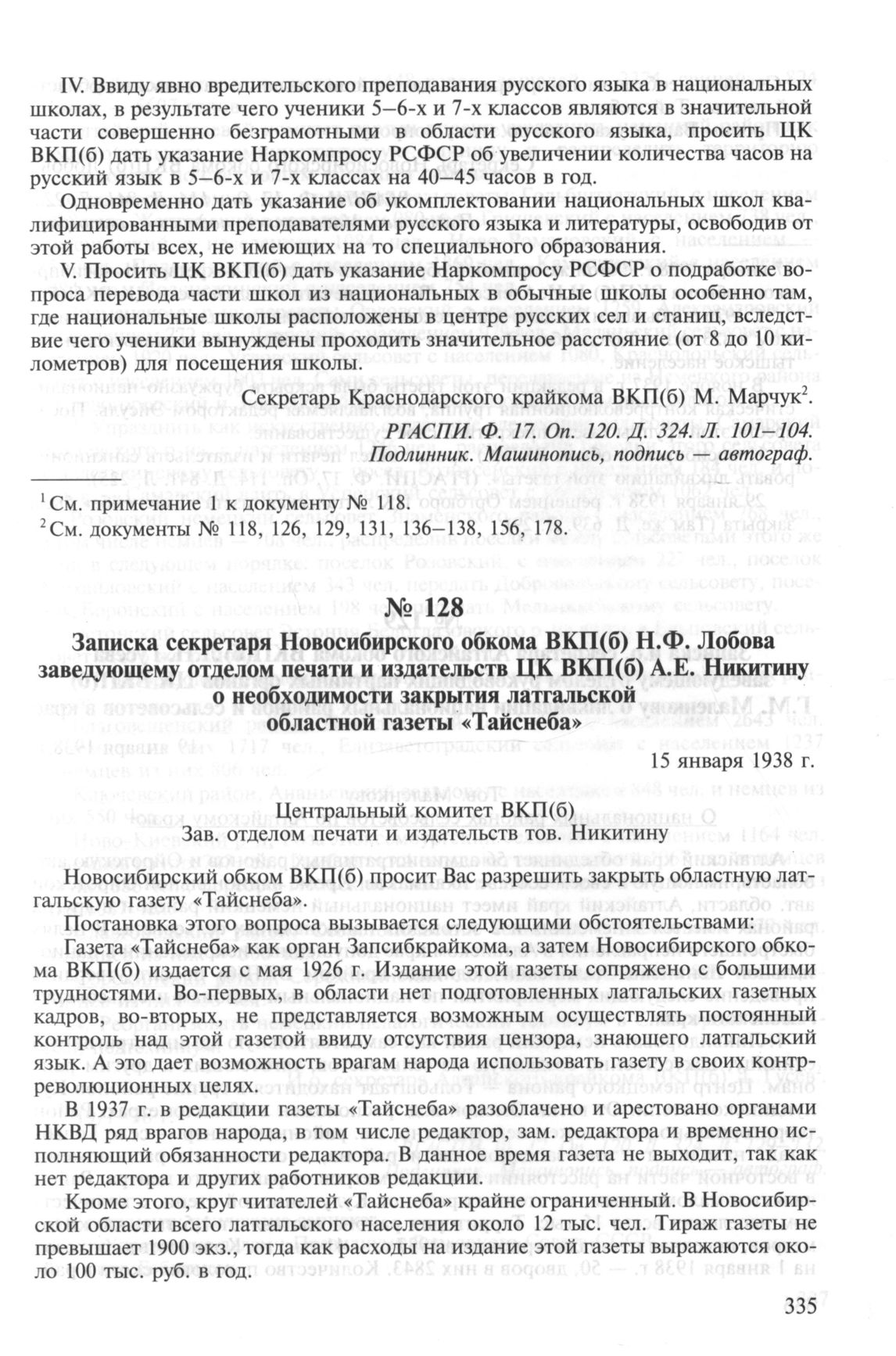 Записка секретаря Новосибирского обкома ВКП(б) Н.Ф. Лобова заведующему отделом печати и издательств ЦК ВКП(б) А.Е. Никитину о необходимости закрытия латгальской областной газеты «Тайснеба». 15 января 1938 г. // РГАСПИ. Ф. 17. Oп. 114. Д. 841. Л. 226. Подлинник. Машинопись, подпись — автограф.