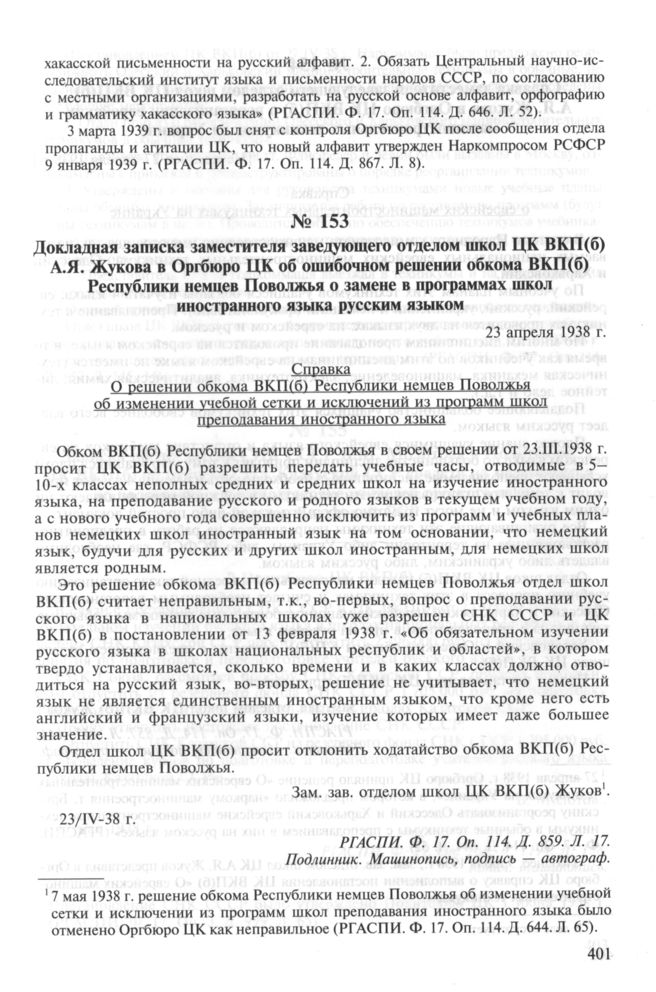 Докладная записка заместителя заведующего отделом школ ЦК ВКП(б) А.Я. Жукова в Оргбюро ЦК об ошибочном решении обкома ВКП(б) Республики немцев Поволжья о замене в программах школ иностранного языка русским языком. 23 апреля 1938 г. // РГАСПИ. Ф. 17. Оп. 114. Д. 859. Л. 17. Подлинник. Машинопись, подпись — автограф.