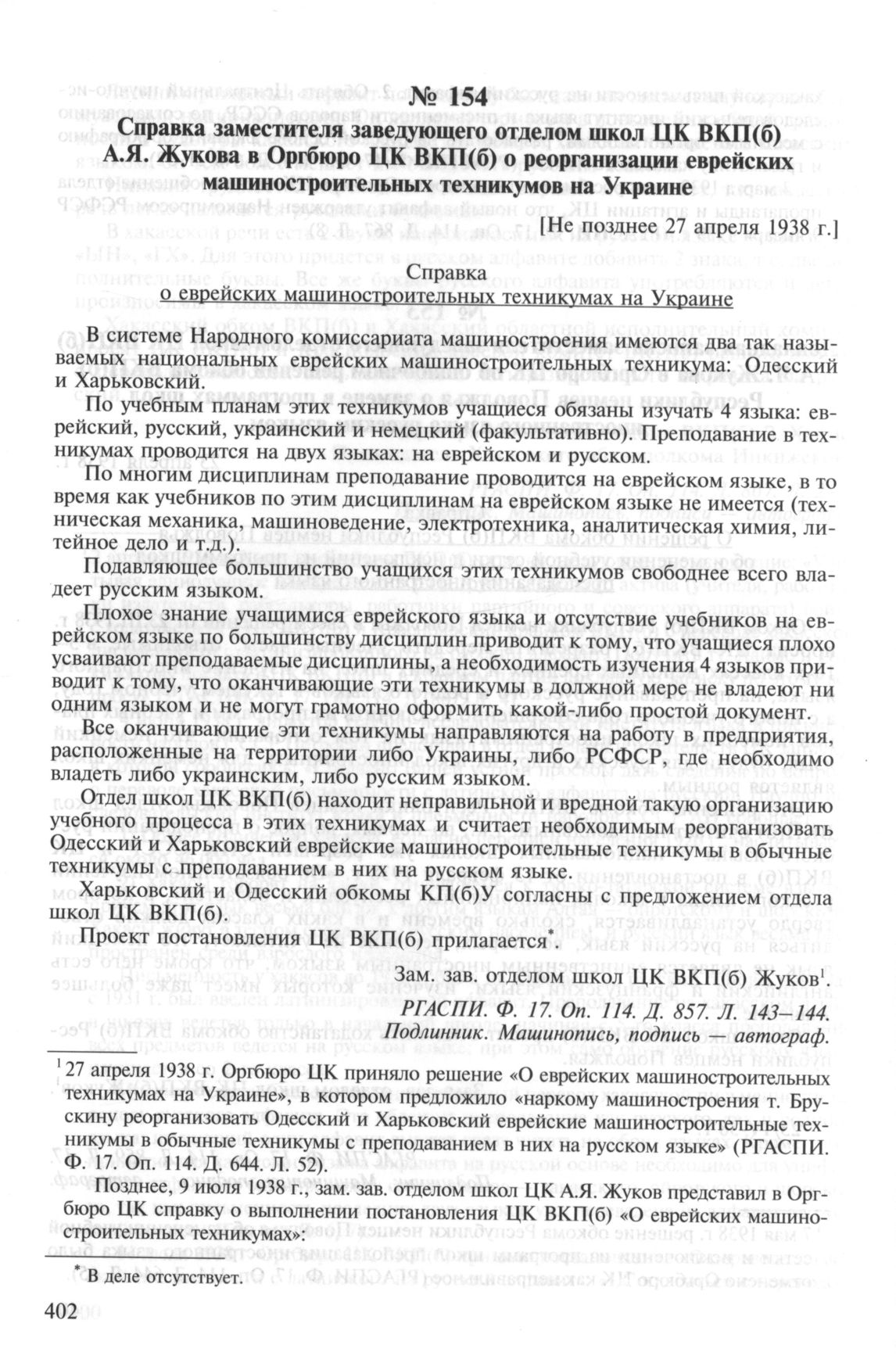 Справка заместителя заведующего отделом школ ЦК ВКП(б) А.Я. Жукова в Оргбюро ЦК ВКП(б) о реорганизации еврейских машиностроительных техникумов на Украине. [Не позднее 27 апреля 1938 г.] // РГАСПИ. Ф. 17. Oп. 114. Д. 857. Л. 143-144. Подлинник. Машинопись, подпись — автограф.