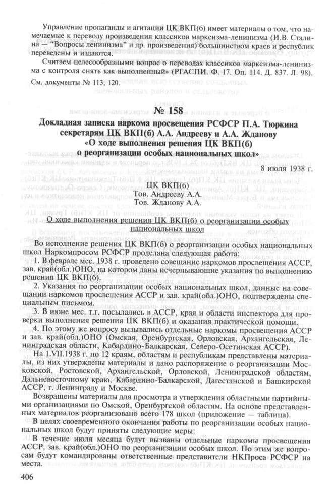 Докладная записка наркома просвещения РСФСР П.А.Тюркина секретарям ЦК ВКП(б) А.А. Андрееву и А.А. Жданову «О ходе выполнения решения ЦК ВКП(б) о реорганизации особых национальных школ». 8 июля 1938 г. // РГАСПИ. Ф. 17. Oп. 114. Д. 837. Л. 107, 107 об., 108. Подлинник. Машинопись, подпись — автограф.