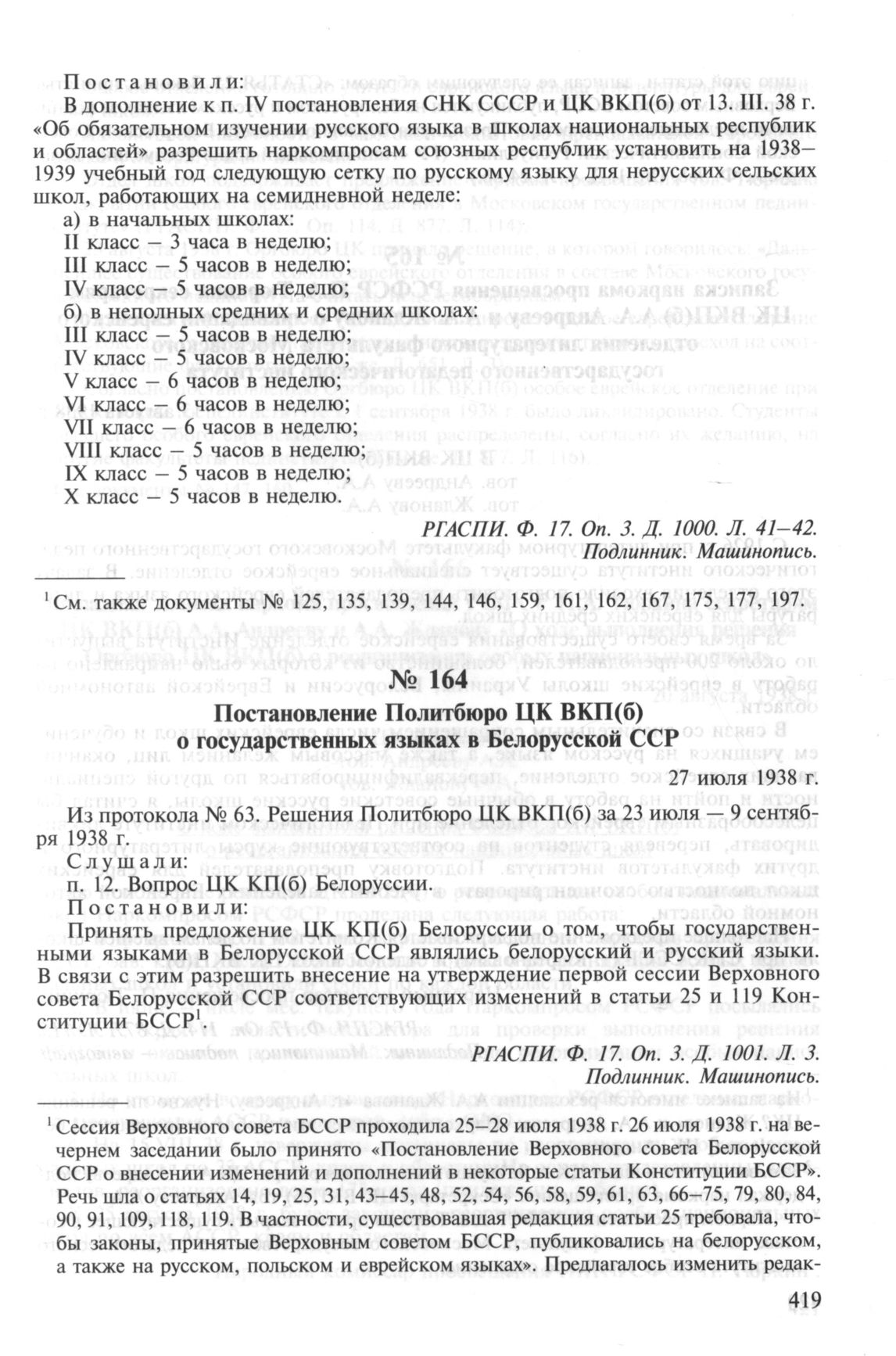 Постановление Политбюро ЦК ВКП(б) о государственных языках в Белорусской ССР. 27 июля 1938 г. // РГАСПИ. Ф. 17. Oп. 3. Д. 1001. Л. 3. Подлинник. Машинопись.