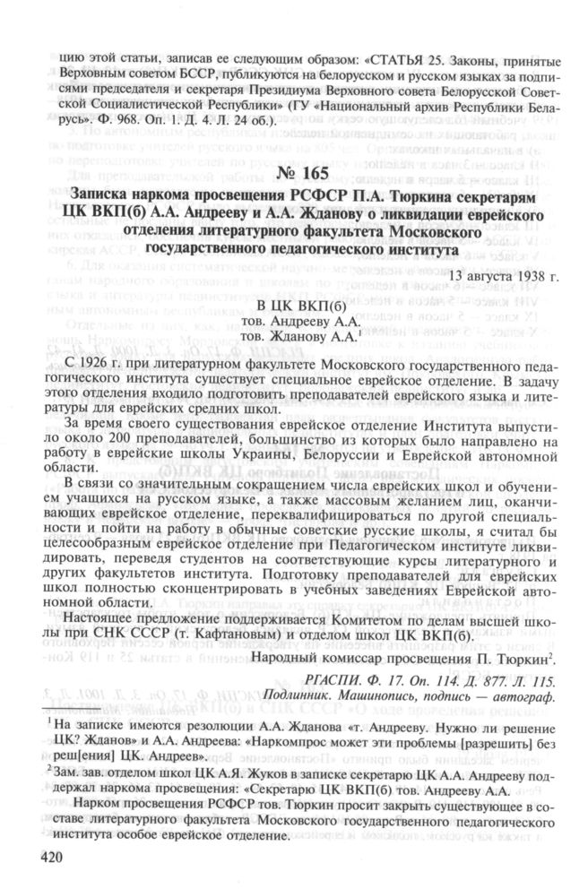 Записка наркома просвещения РСФСР П.А. Тюркина секретарям ЦК ВКП(б) А.А. Андрееву и А.А. Жданову о ликвидации еврейского отделения литературного факультета Московского государственного педагогического института. 13 августа 1938 г. // РГАСПИ. Ф. 17. Oп. 114. Д. 877. Л. 115. Подлинник. Машинопись, подпись — автограф.