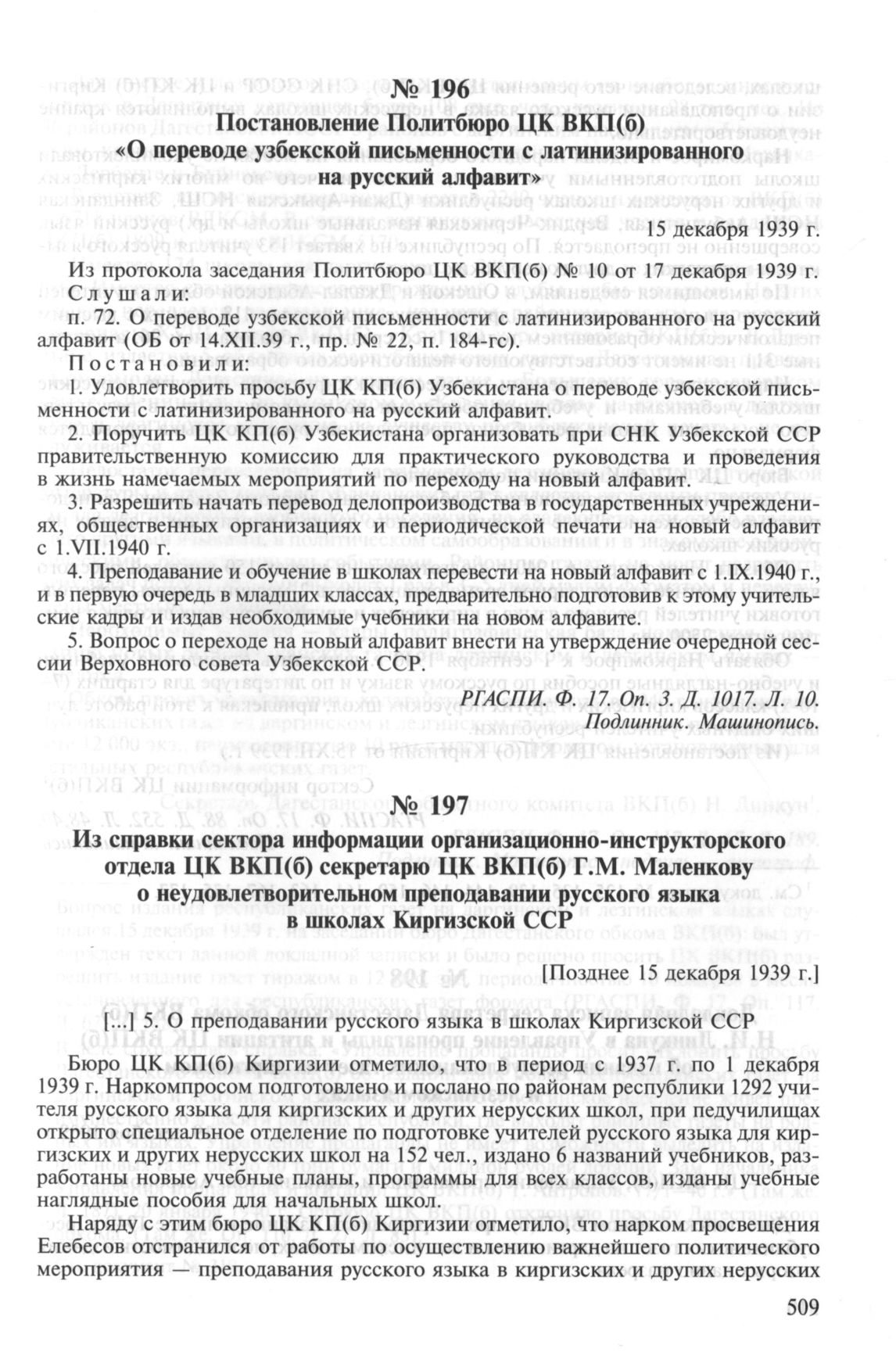 Из справки сектора информации организационно-инструкторского отдела ЦК ВКП(б) секретарю ЦК ВКП(б) Г.М. Маленкову о неудовлетворительном преподавании русского языка в школах Киргизской ССР. [Позднее 15 декабря 1939 г.] // РГАСПИ. Ф. 17. Oп. 88. Д. 552. Л. 48,49. Подлинник. Машинопись.