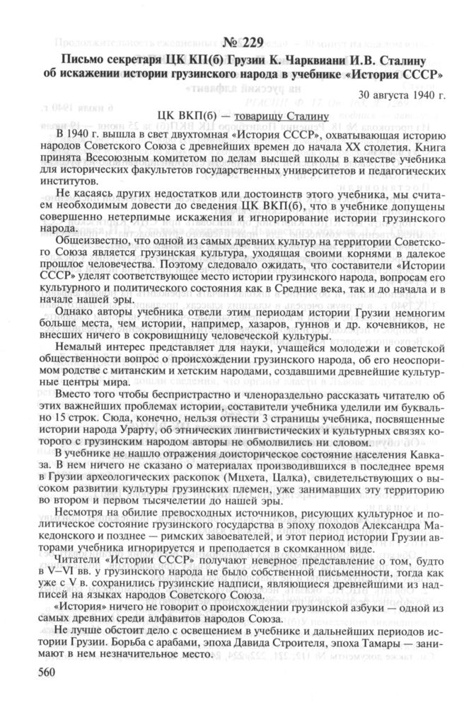 Письмо секретаря ЦК КП(б) Грузии К. Чарквиани И.В. Сталину об искажении истории грузинского народа в учебнике «История СССР». 30 августа 1940 г.