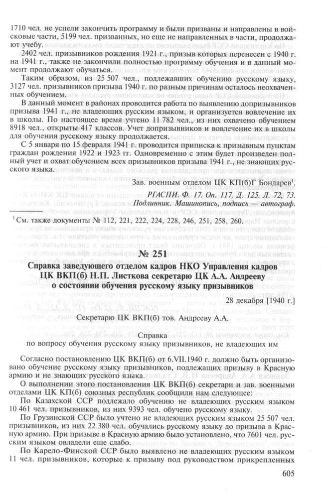 Справка заведующего отделом кадров НКО Управления кадров ЦК ВКП(б) Н.П. Листкова секретарю ЦК А.А. Андрееву о состоянии обучения русскому языку призывников. 28 декабря [ 1940 г.] // РГАСПИ. Ф. 17. Oп. 117. Д. 125. Л. 47-48. Подлинник. Машинопись, подпись — автограф.