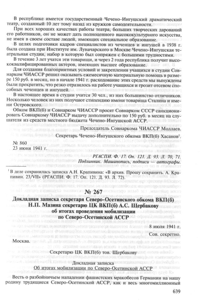 Докладная записка секретаря Северо-Осетинского обкома ВКП(б) Н.П. Мазина секретарю ЦК ВКП(б) А.С. Щербакову об итогах проведения мобилизации по Северо-Осетинской АССР. 8 июля 1941 г. // РГАСПИ. Ф. 17. Oп. 121. Д. 98. Л. 73-81. Подлинник. Машинопись, подпись — автограф.