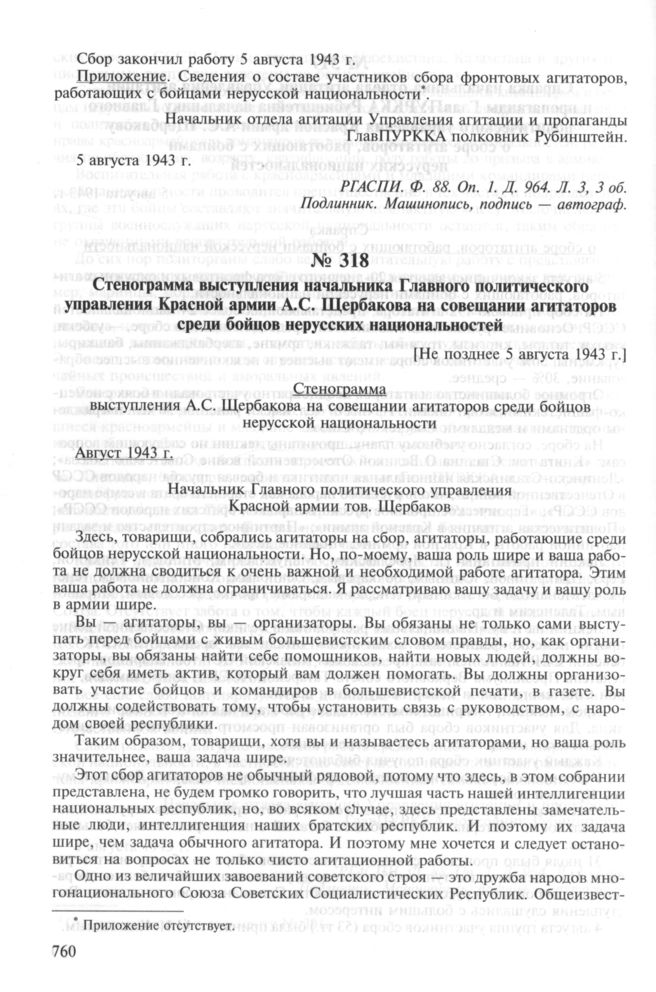 Стенограмма выступления начальника Главного политического управления Красной армии А.С. Щербакова на совещании агитаторов среди бойцов нерусских национальностей. [Не позднее 5 августа 1943 г.] // РГАСПИ. Ф. 88. Oп. 1. Д. 967. Л. 1-15. Копия. Машинопись.