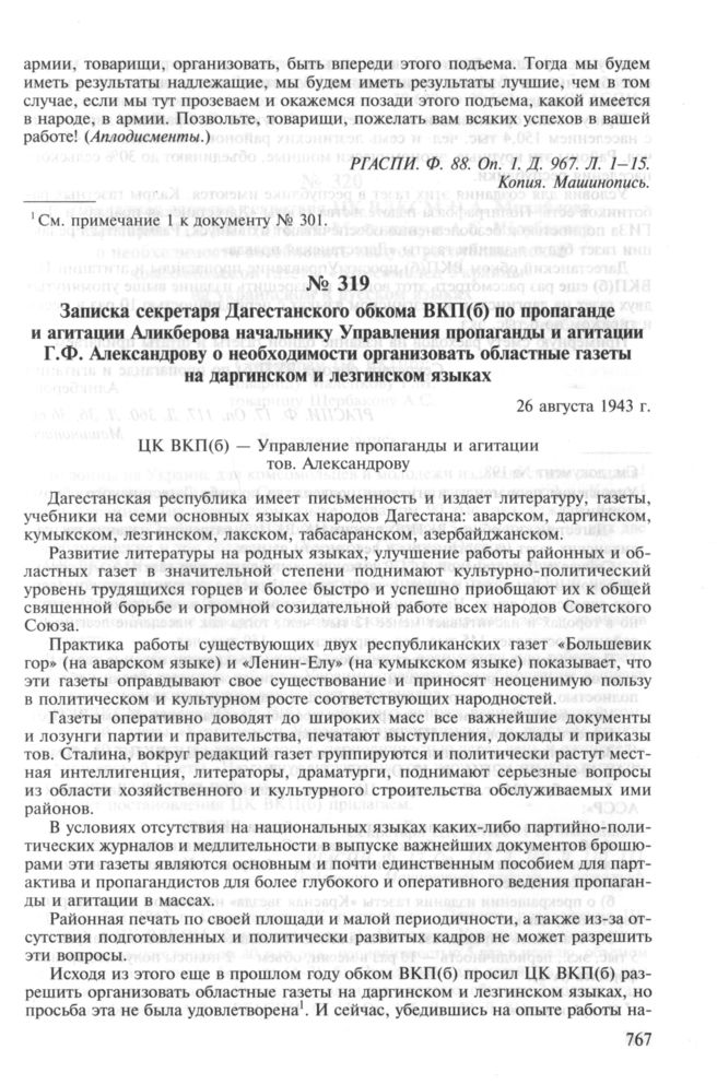 Записка секретаря Дагестанского обкома ВКП(б) по пропаганде и агитации Аликберова начальнику Управления пропаганды и агитации Г.Ф. Александрову о необходимости организовать областные газеты на даргинском и лезгинском языках. 26 августа 1943 г. // РГАСПИ. Ф. 17. Oп. 117. Д. 360. Л. 36, 36 об. Машинопись.