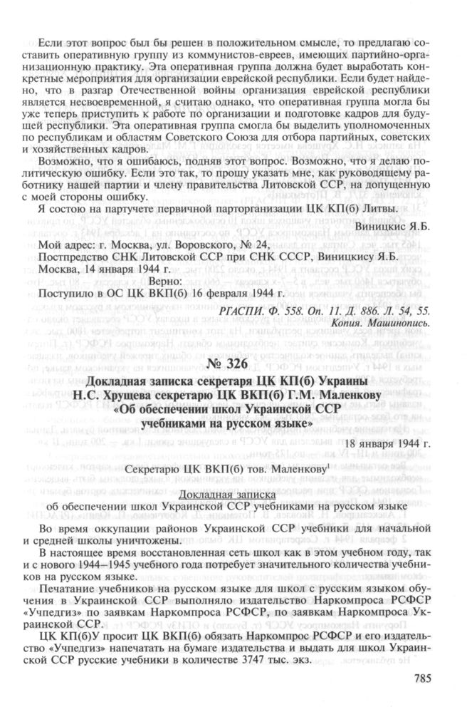 Докладная записка секретаря ЦК КП(б) Украины Н.С. Хрущева секретарю ЦК ВКП(б) Г.М. Маленкову «Об обеспечении школ Украинской ССР учебниками на русском языке». 18 января 1944 г.