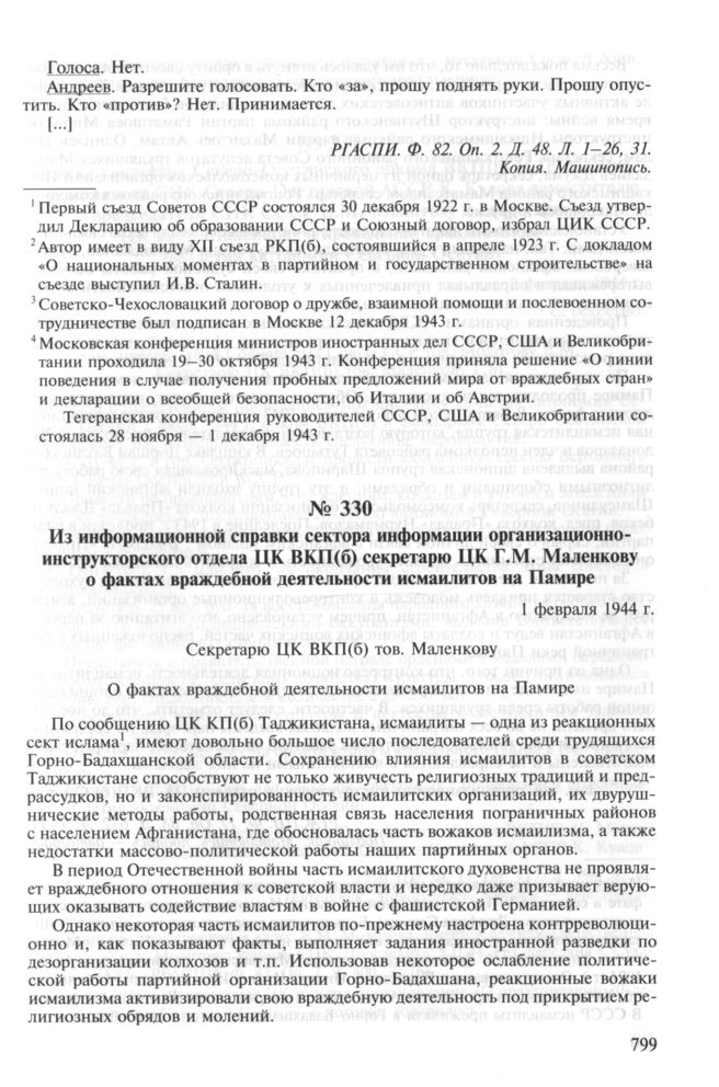 Из информационной справки сектора информации организационно-инструкторского отдела ЦК ВКП(б) секретарю ЦК Г.М. Маленкову о фактах враждебной деятельности исмаилитов на Памире. 1 февраля 1944 г. // РГАСПИ. Ф. 17. Oп. 88. Д. 632. Л. 9-11. Подлинник. Машинопись, подпись — автограф.