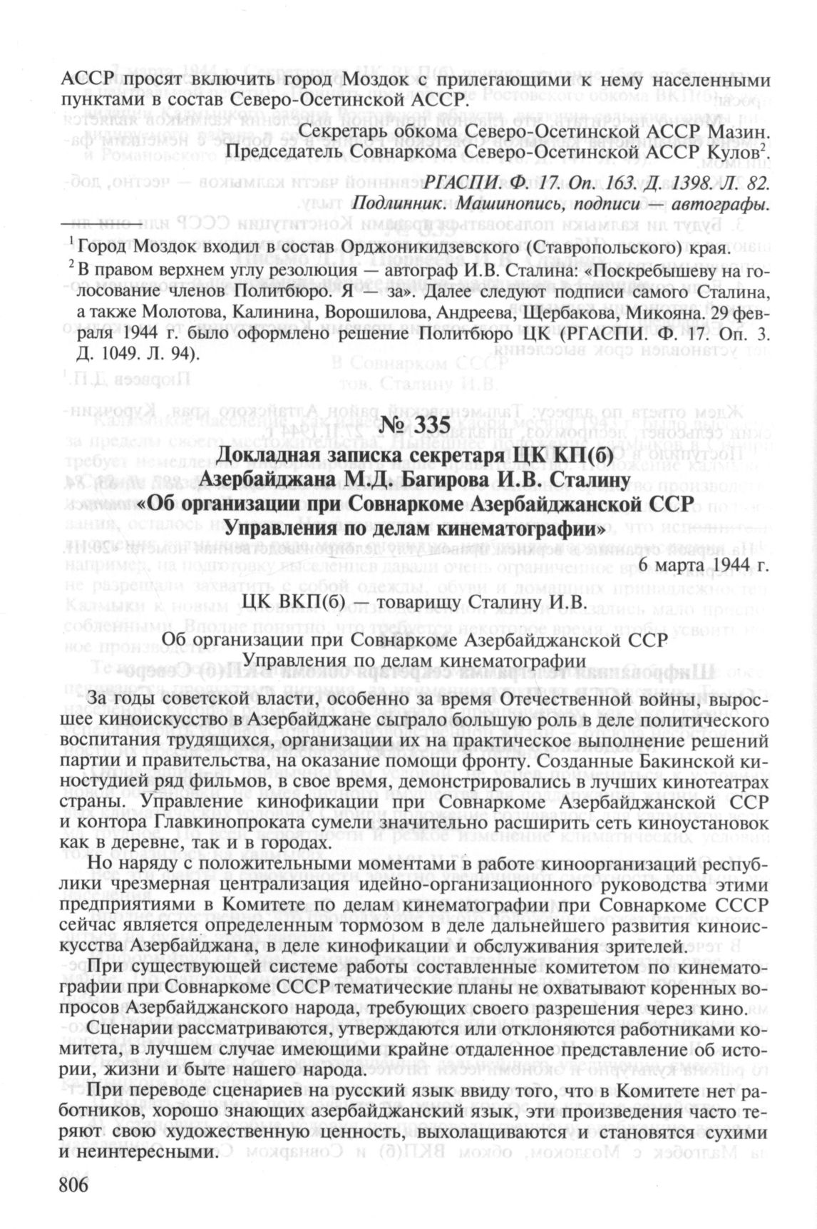 Докладная записка секретаря ЦК КП(б) Азербайджана М.Д. Багирова И.В. Сталину «Об организации при Совнаркоме Азербайджанской ССР Управления по делам кинематографии». 6 марта 1944 г. // РГАСПИ. Ф. 17. Oп. 117. Д. 395. Л. 8, 9. Подлинник. Машинопись, подпись — автограф.
