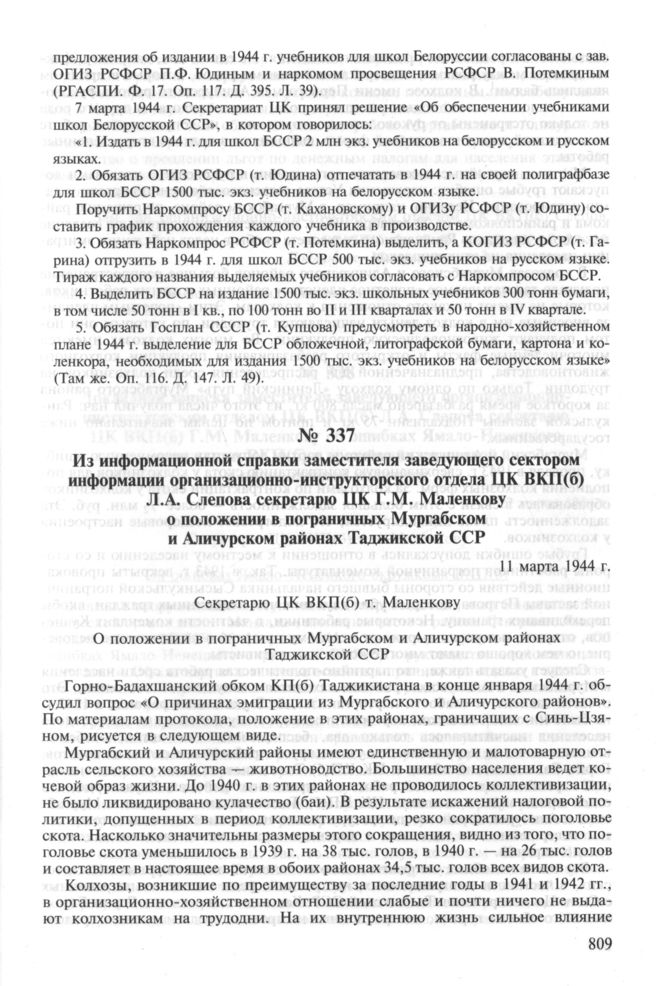 Из информационной справки заместителя заведующего сектором информации организационно-инструкторского отдела ЦК ВКП(б) Л.А. Слепова секретарю ЦК Г.М. Маленкову о положении в пограничных Мургабском и Аличурском районах Таджикской ССР. 11 марта 1944 г. // РГАСПИ. Ф. 17. Oп. 88. Д. 632. Л. 27-29. Подлинник. Машинопись, подпись — автограф.