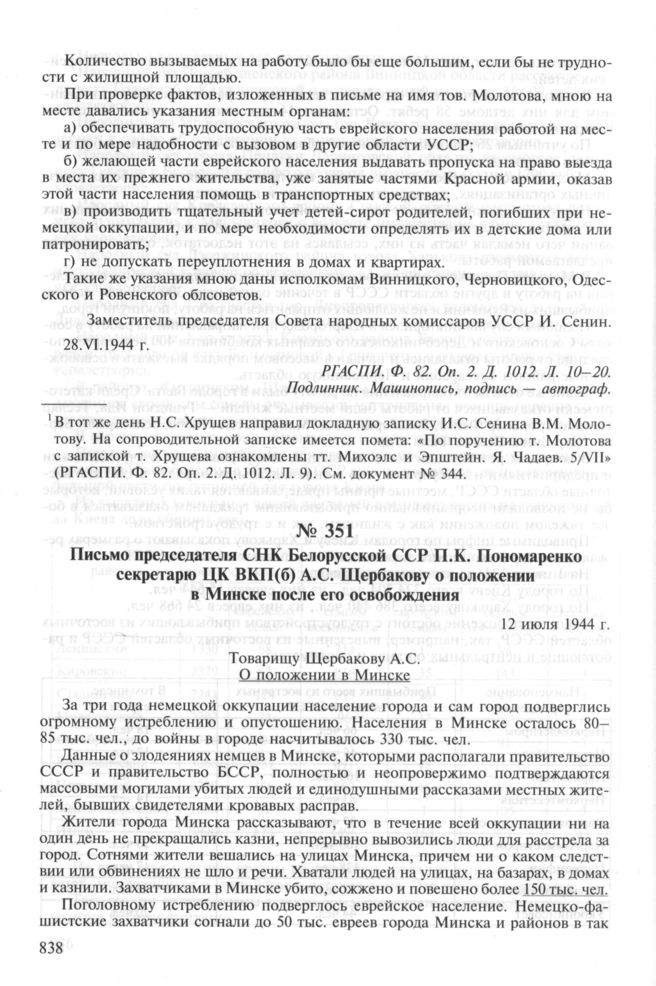 Письмо председателя СНК Белорусской ССР П.К. Пономаренко секретарю ЦК ВКП(б) А.С. Щербакову о положении в Минске после его освобождения. 12 июля 1944 г. // РГАСПИ. Ф. 17. Oп. 121. Д. 332. Л. 71-75. Подлинник. Машинопись, подпись — автограф.
